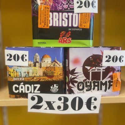 Disfruta de fuegos artificiales en cualquier evento o celebración. Las baterías son pequeñas cajas con tubos en su interior desde los que salen disparadas cargas con diferentes efectos como peonias, crisantemos, kamuros, intermitentes etc. Disponemos de una gran variedad de efectos y tamaños para elegir y siempre con la mejor calidad del mercado.