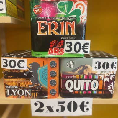 Disfruta de fuegos artificiales en cualquier evento o celebración. Las baterías son pequeñas cajas con tubos en su interior desde los que salen disparadas cargas con diferentes efectos como peonias, crisantemos, kamuros, intermitentes etc. Disponemos de una gran variedad de efectos y tamaños para elegir y siempre con la mejor calidad del mercado.